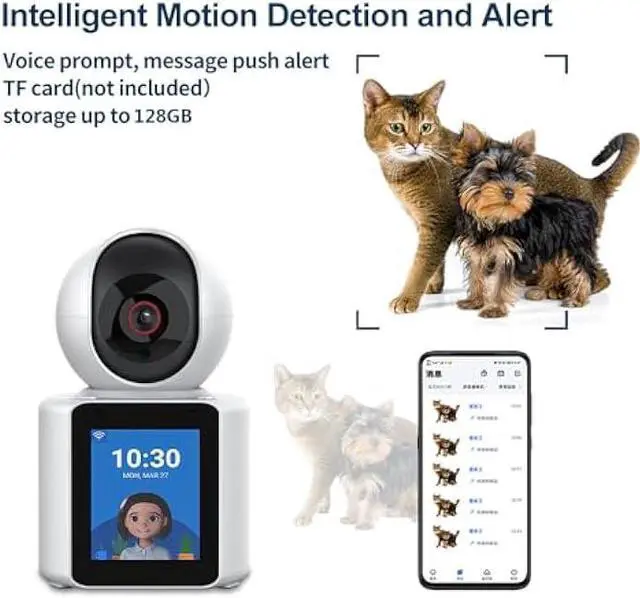 Wireless Indoor Security Camera The dog camera has built-in human shape detection and crying detection algorithms, smart sensors can accurately push alert messages based on orders, it's ready to alert you as soon as the baby or pets do something, providing peace of mind to users while they are away. the video calling camera equipped with dual digital mic array, 4m pickup distance, up to 8m night vision distance, just need to wifi pairing binding device to monitor at anywhere, anytime.