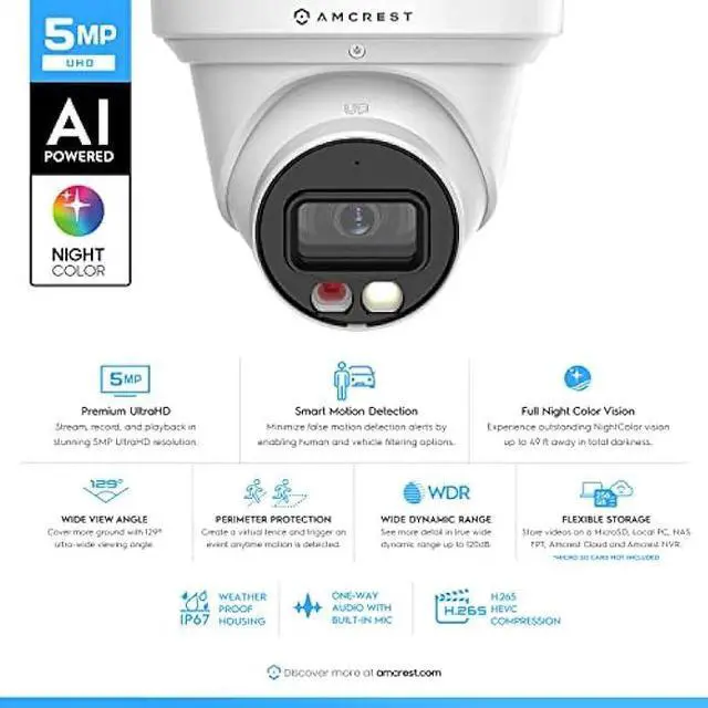 DAY OR NIGHT, RAIN OR SHINE Built to weather any storm and the darkest of nights, this outdoor POE IP Turret Camera features a heavy-duty metal weatherproof IP67 housing, built-in microphone for one-way audio, as well as nightvision up to 49 feet. Dual H. 265/H. 264 compression allows for maximum encryption with the latest technology as well as backward compatibility with legacy platforms. Works with Alexa through AmcrestCloud (AI features Not Supported with Alexa).
