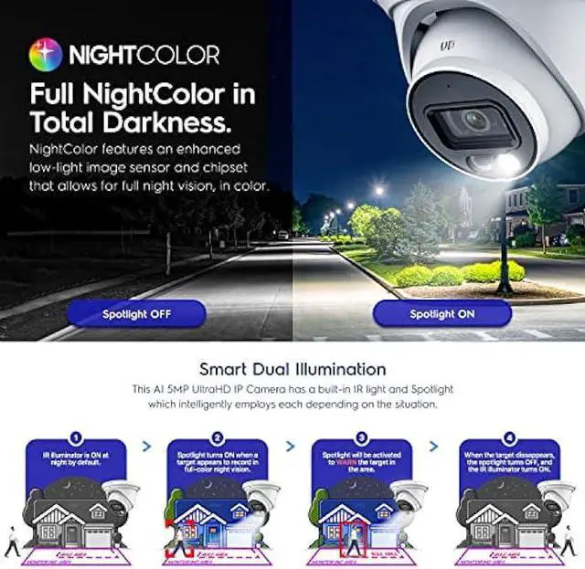 AI FEATURES & DUAL ILLUMINATION AI Turret PoE IP Camera features Human & Vehicle Detection, IVS (Tripwire, Intrusion Detection) which triggers an event anytime a human or vehicle crosses the defined area (prevents false alerts). Dual illumination night vision with Full NightColor warm/white LED & IR-LED nightvision. 5-Megapixel @20fps video with a super-wide 129° viewing angle. PoE injector or switch required; not included, sold separately.