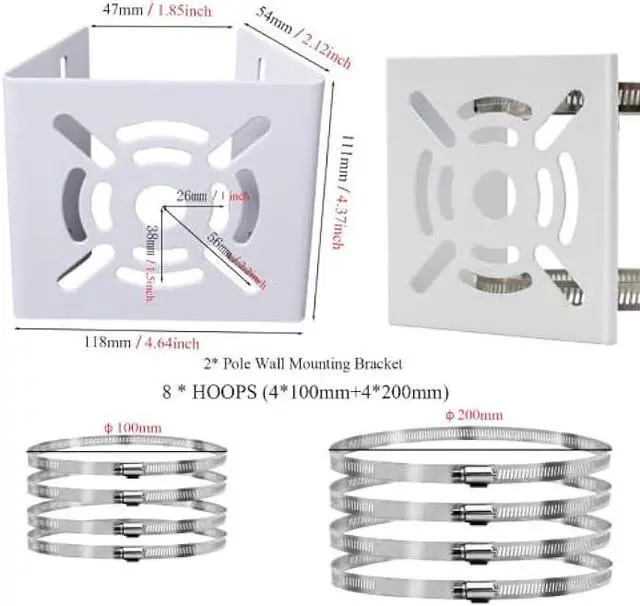 PACKAGE INCLUDES: 2x wall mounting bracket + 4x 100mm + 4x 200mm loops. Most poles can be fitted using 4 x 100mm pole mounting stainless steel hoops, we also give you 4 x 200mm loops for easy mounting on thicker poles.