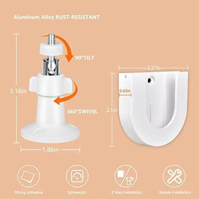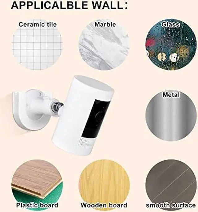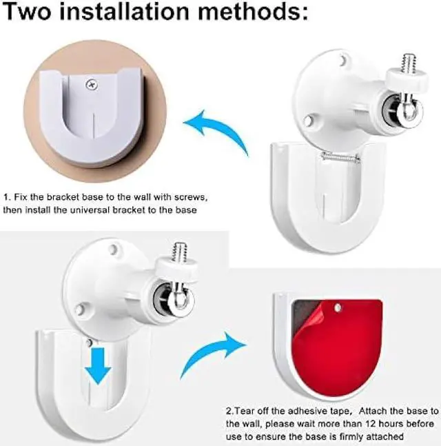 Two way installation methods: Two methods for you to choose, use screws or adhesive tape to fix the wall mount holder, Please make sure the wall is smooth and flat if using self-adhesive tape mounting and wait at least 6 hours to install the Ring Indoor Cam to make the tape closely attach to the desired surface