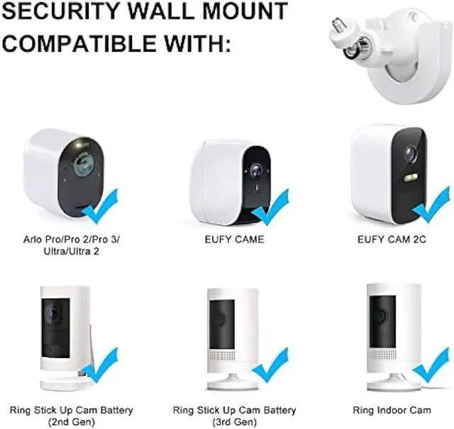 Compatibility with various models: Our security wall mount is compatible with the Arlo Pro, Arlo Pro 2, Arlo Pro 3, Arlo Ultra, Arlo Ultra 2, Arlo HD, Arlo Go, and Arlo Light as well as other compatible camera models including Ring indoor cam, Ring Stick Up Cam Battery, eufyCam E/2C