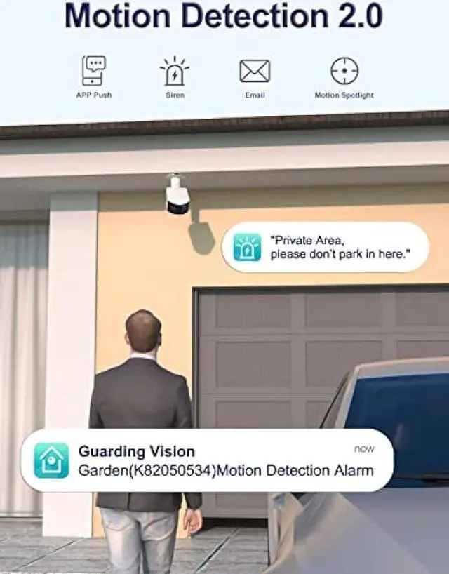 Motion Detection and Warning Equipped with person and vehicle detection, this wide-angle security camera can differentiate between objects to prevent false alarms. When motion is detected, in addition to sending push notifications to your phone, the camera also has flashing lights and speakers to alert people and cars that they are being recorded.