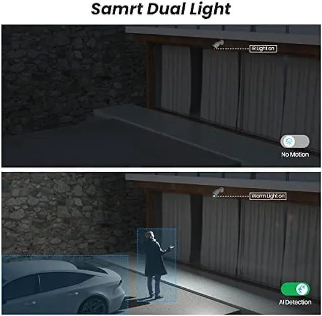 100ft Smart Dual Light Color Night VisionThis outdoor 4K PoE camera enables you to view clear images with vivid colors in live video and playback. Once an intruder is detected, the camera's lights will be automatically turned on to warn potential perpetrators. Besides, you can change the night vision mode to IR night vision.