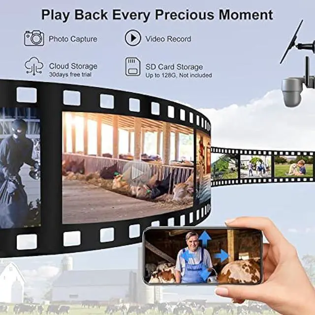 [HD Lens & No Blind Spot] Solar security camera supports PTZ355° horizontal, 90° vertical rotation, and 4X digital Zoom to cover your idea areas without blind spots. Easily move the camera by phone app to check every corner when receiving alerts. Never miss your visitors or lose any packages from now on.