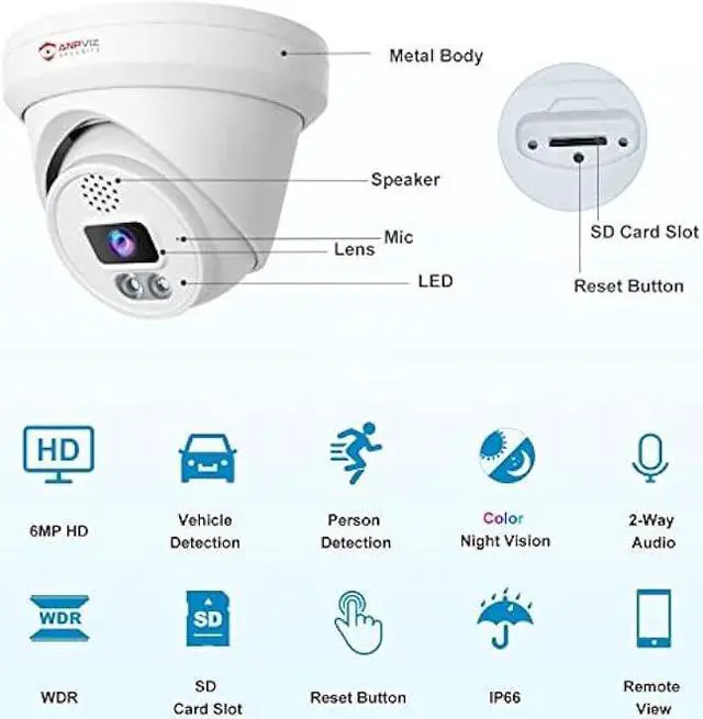 6MP Ultra HDThe PoE camera has a high resolution of 6MP (3072 x 2048), which can record clearer videos and images than 5MP. IP66 Waterproof security camera PoE. (PoE Camera Outdoor supports ON-VIF NVR and third party software such as ISPy, BlueIris, Without Power Supply, Non PTZ Camera, Non-pan)