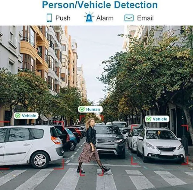 Intelligent Person/Vehicle DetectionThe IP Camera Outdoor uses artificial intelligence detection technology, this outdoor IP camera can detect people and cars in all actions. When a suspicious person or car enters your home or store, the camera alerts you and sends real-time notifications or email notifications to your device.
