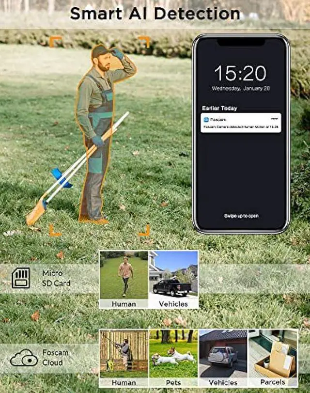 Smart AI Detection: Our home camera can identify human and vehicles in terms of their shapes without the cloud service, can also identify pets, and parcels based on the latest AI algorithm with the cloud service. It support adjusts sensitivity levels to minimize false alarms. Say goodbye to the unwanted alarms triggered by moving branches or flying bugs.