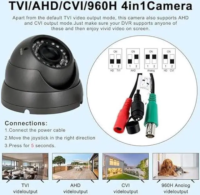 2.0MP HD 1080P 4-IN-1Dome Security CameraThis dome security camera 1080P supports 4 different video output 1080P TVI, 1080P AHD, 1080P CVI and CVBS (960H). Required 1080P/1080Lite/1080N TVI/AHD/CVI DVR ( SDI DVR not comptiabe ) ( Some 720P DVR not compatiable ) Required coaxiable BNC cable and power adapter but not included.