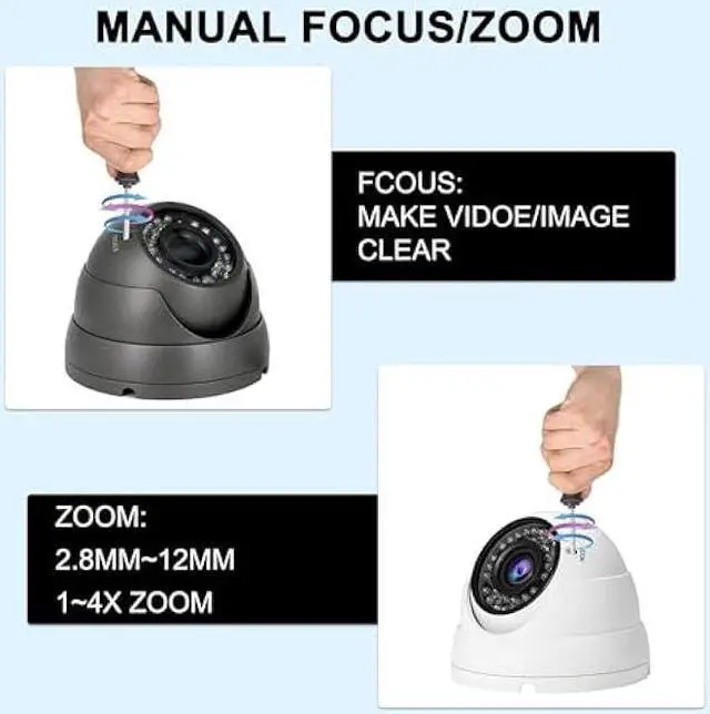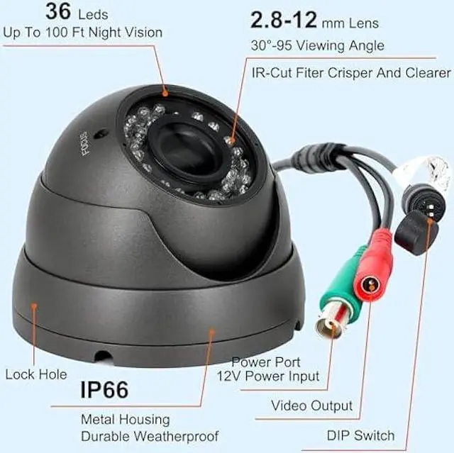 36 Leds up to 98ft night visionThis dome security camera 2.8 -12mm Manual Varifocal lens, With 36 pcs IR infrared LEDs, it has 98ft IR range, take clear picture during both day- and night-time. IP66 weatherproof housing provides protection from elements, including dust and sand, as well as harsh weather conditions, such as rain and snow. ''',