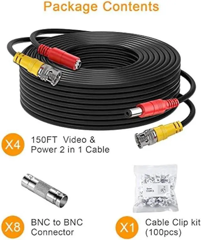 Easy to use: The camera wire has a 150ft prefabricated, multi-purpose conjoined cable, including 8pcs BNC female-to-BNC female connectors and 1xCable Clip Kit (100pcs), suitable for indoor and outdoor, plug and use.