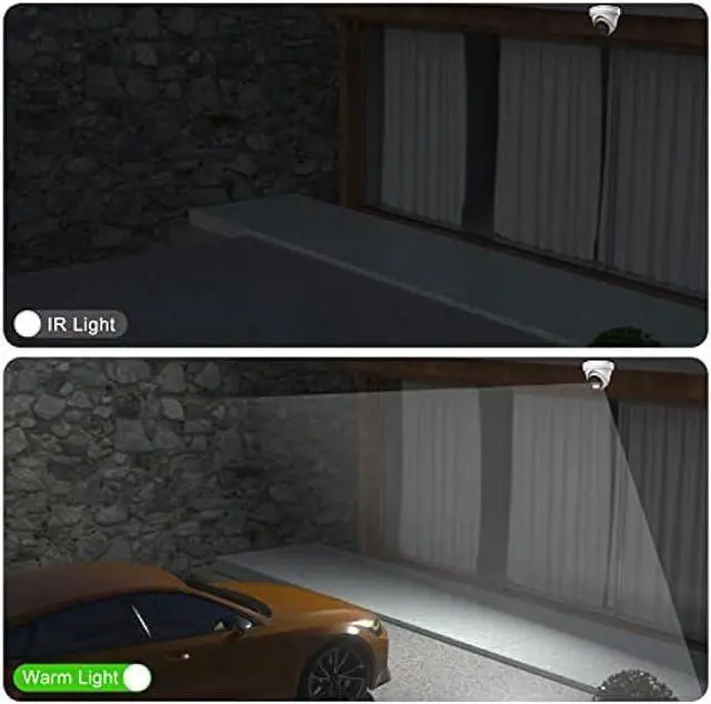 Smart Dual Light Color Night VisionEquipped with IR and warm light sources, the upgraded 5MP poe ip camera ensures clear imaging in various lighting conditions. At night, warm light illuminates when people or vehicles are detected, providing colorful images. In the absence of objects, it switches to IR mode for clear black-and-white images.