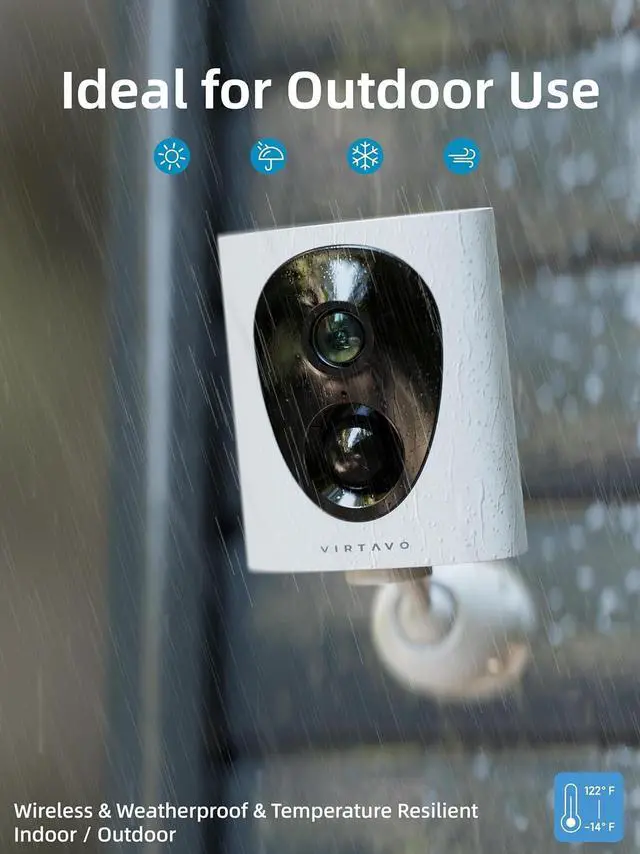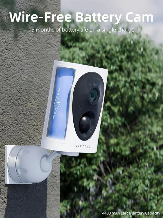 Long-Lasting Battery & Weatherproof DesignEnhance your home security with virtavo security cameras wireless outdoor, equipped with a robust 4400mAh rechargeable lithium battery for 1-3 months of operation per charge. This weatherproof outdoor camera wireless ensures reliable performance in any environmental conditions. No need for frequent recharging or disassembly.