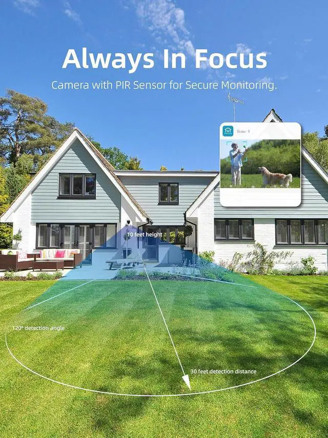 Advanced PIR Motion Detection & Smart AlertsStay informed with wireless security camera outdoor is superior 30-foot range PIR motion detection technology. Receive instant alerts and engage in two-way communication directly through the HOME V app. Optional cloud subscription enhances detection accuracy for humans, vehicles, and animals, minimizing false alarms.