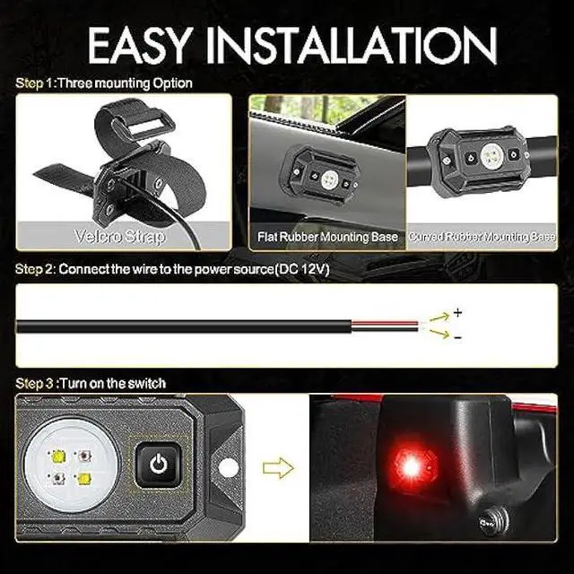 EASILY INSTALL AND REMOVE: The universal LED dome light is available in an adjustable Velcro strap and two types of rubber mounting pads. You can choose different methods to mount the dome light, depending on your needs. Such as, using the flat and curved mounting pads on the flat and curved place respectively, or using the Velcro strap on the roll cage or roll bar within 4 inch diameter not need additional tools
