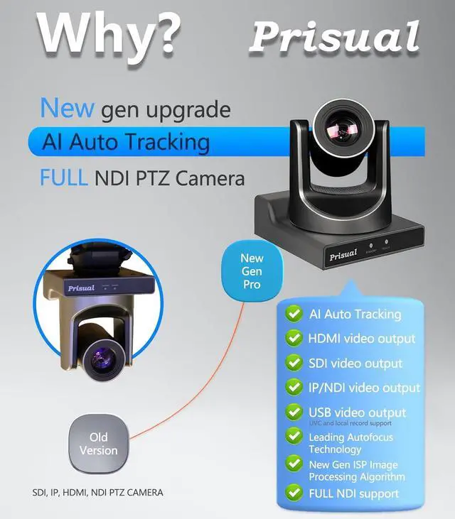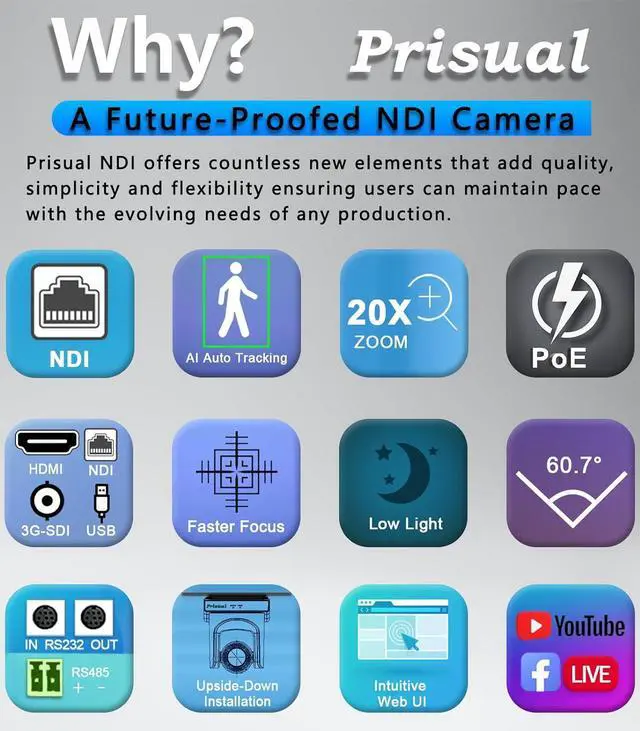 Prisual NDI Camera built in NewTek NDI license streaming capable for low latency video streaming and PTZ control over NDI|HX Protocol. Simultaneous stream SDI, HDMI, IP and NDI outputs complete the camera as a comprehensive solution, you can control via your NDI workflow, IP web control, or integrate RS-485 and RS-232 serial control.