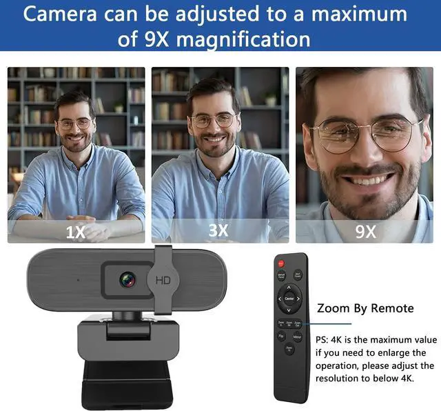 Remote 1-9x Zoom& AI Auto-zoom select 2K and below resolution, you can enable EPTZ function, remote control can make the view zoom in and out 3 times. When zoomed in, the remote allows the view to move smoothly up, down, left and right. Our webcam AI will also automatically adjust the optimal focus to your scene.