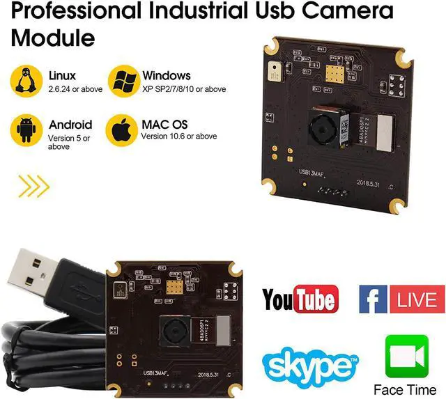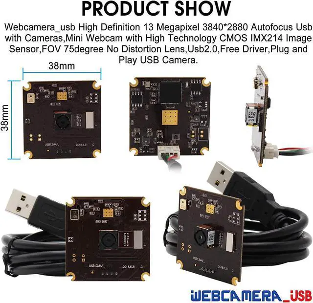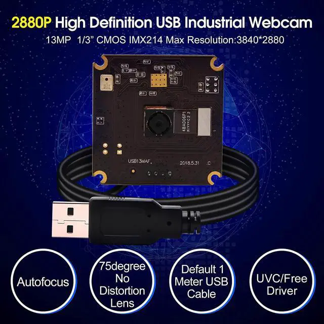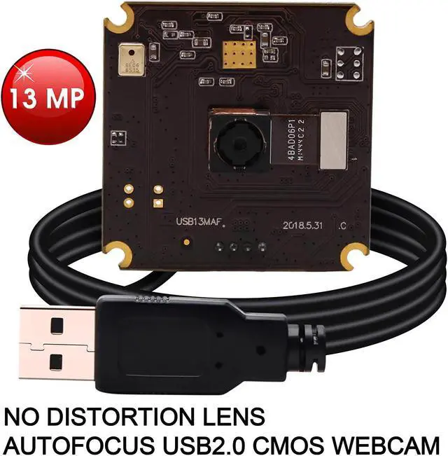 13MP resolution, support 3840X2880@10fps, 3264X2448@15fps, 2048x1536@30fps and YUV video streaming. Mini Autofocus Lens USB camera can view 8CM-100M long distance, true and no distortion color image.