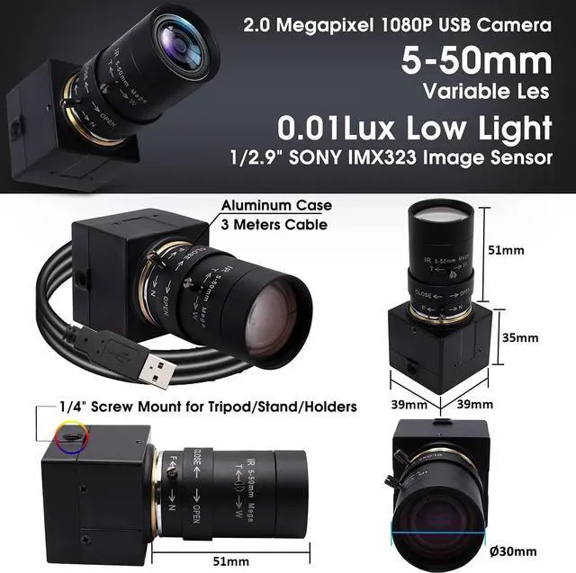 Varifocal Lens: FHD 1080P Webcam with CS mount 5-50mm zoom lens, manual focus and 10X optical zoom camera adjustable iris, focus and focal length for different angle and viewings. You can focusing in close or make long distance shots. Minimum Focusing Distance <1cm. USB camera with IR filter@650±10nm for true color day images/videos