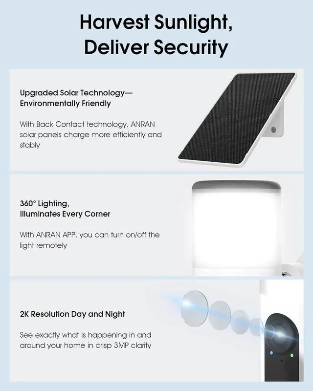 Light: ANRAN combines security camera and porch light into one! The light is comfortably bright without being disruptive to you or your neighbors at night. Plus, you can set the light to turn on automatically with motion activation. And this upgraded version adds a solar panel for sustainable power. The daily direct sunlight is sufficient to continuously power the wireless camera, you don' t need to remove the camera to charge it. Mount it on your wall for 365-day uninterrupted surveillance.
