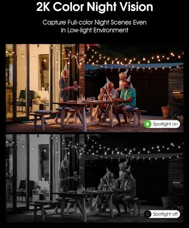 2K QHD Video & Color Night Vision: The security camera outdoor offers a 3MP image quality, 1.5 times better than 1080p cameras. Great image and video quality with 33ft visible range. You can view sharp color night vision even in poor light with this home security camera.