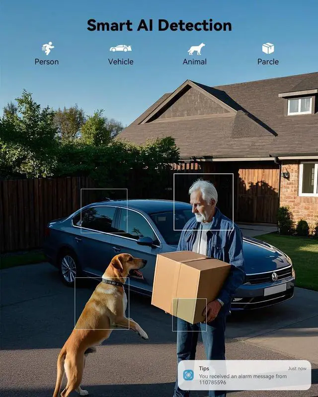 Advanced AI Recognition & Smart Alerts: Featuring AI-powered detection, this solar security camera can distinguish between people, vehicles, and pets, and works with Alexa and Google. It also includes smart light and sound alarms (default off) triggered by motion, along with PIR human detection up to 13 meters, providing customizable alert zones for enhanced security.