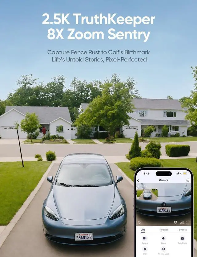 Local AI Tracking & Smart Patrol: 360° pan tilt auto-tracking + 8X zoom detects motion, human, vehicle, animal, loitering, lens blockage & sound (barks, horns). 6-way patrol, custom voice alarms + strobe lightsdeter intruders