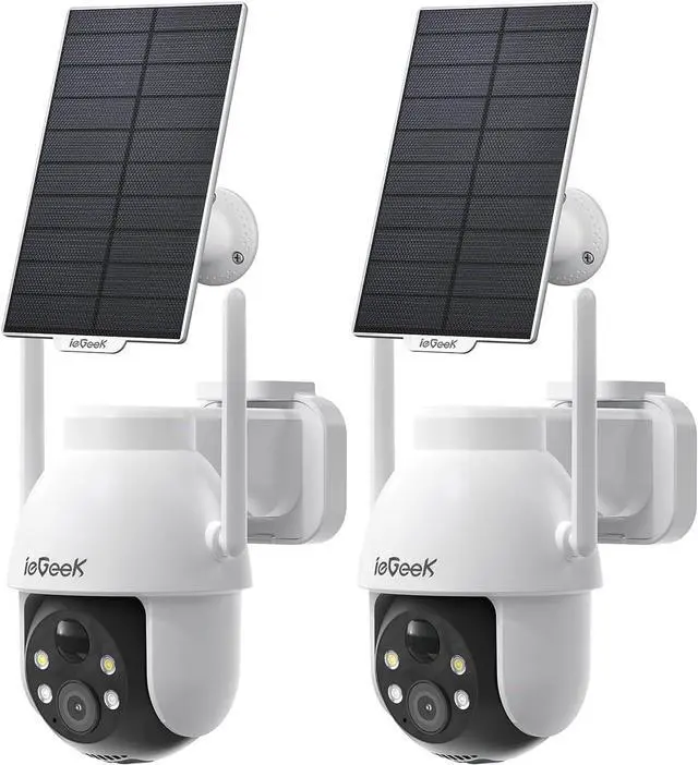 2K Full Color Image & 360 ViewThe ieGeek security camera is equipped with the latest CMOS technology and 3MP high pixel, which provides 1.5 times more detail than traditional 1080p cameras. Built-in 2 IR lights and 2 white lights provide you with clearer color night vision. Wireless solar security camera outdoor with 355° pan, 120° tilt, and 4x digital zoom capability (no auto-tracking), provides 360° surveillance of any corner to secure cars, yards, and other properties.