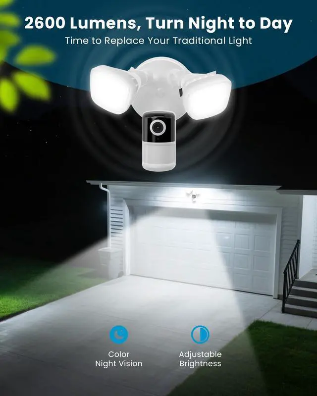 Real-Time Remote MonitoringThe outdoor camera supports adjusting the PIR detection sensitivity/light brightness and custom settings alarm area/lighting plan via the ieGeek Cam or CloudEdge app. Whether you are out or busy at home, you can monitor your home security or take warning actions (lighting/siren/audio) at any time. This floodlight cam has 2pcs 2600LM light which is brighter than others. Deters intruders and protects your property with motion-activated 2, 600 lumens of ultra-bright floodlight.