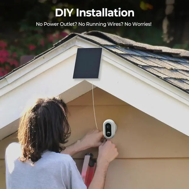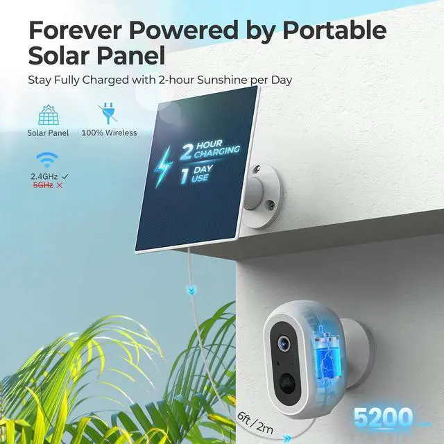 [Rechargerable Battery/Solar Power] The Rechargerable Internal batteryeven without sunlight, it can be used for 50 days, and it equipped with a solar panel, It can work for 365 days with just 2 hours of sunlight per day, powering 24 hours of use. (Work with 2.4GH z Wifi only)
