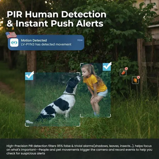 [Multi-Alarm & IP 65] PIR motion detection technology, which triggers instant alerts to your phone via the " Laview" app when motion is detected. With its cutting-edge AI analysis, recognition accuracy rate is as high as 95%, IP65 weather-resistant and performs reliably in various adverse conditions