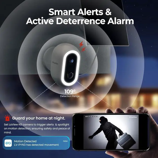 • [Multi-Alarm & IP 65] PIR motion detection technology, which triggers instant alerts to your phone via the "Laview" app when motion is detected. With its cutting-edge AI analysis, recognition accuracy rate is as high as 95% ,IP65 weather-resistant and performs reliably in various adverse conditions