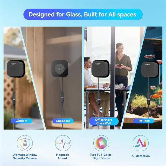 Unique Magnetic Design: Unlike other window cameras on the market, our camera features an innovative magnetic design that makes installation easy, flexible, and efficient. Say goodbye to traditional adhesive and drilling methods! Our window camera can be set up on glass surfaces in just 10 secondsno drilling required. This means it wont damage your doors or windows, and it leaves no traces after installation.
