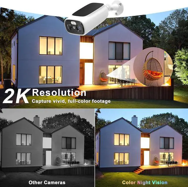 2K HD Video & Advanced Color Night Vision: Experience ultra-clear 2K resolution (2304×1296) 1.5 × sharper than standard 1080p cameras. With dual powerful LED spotlights, these solar-powered security cameras outdoor capture vivid, full-color footage even in low light, delivering 24/7 optimal visibility