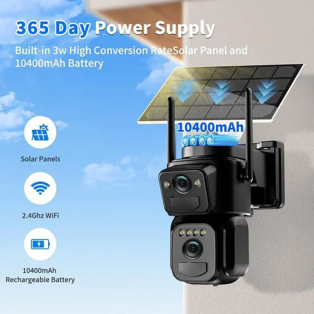 / & This wireless outdoor camera has a 10400mah battery built in to provide continuous power for wireless outside cameras with high conversion rate solar panels. The wifi security camera outdoor with IP66 waterproof can work in any weather. Since the WIFI cam is completely wireless, no power cords or network cable is neededSupport 5GHz/ 2.4GH z WiFi), providing uninterrupted protection for your home for 365 days.