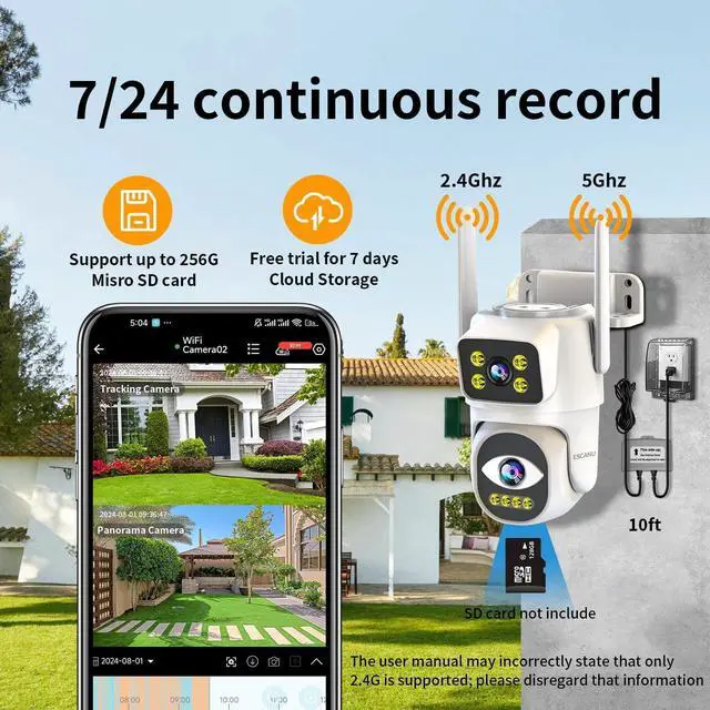 Easy Use & Support 2.4GH z and 5G & 7/24 recording The power source for this outdoor camera is a household electrical outlet. The camera come with adapter, you just need to plug-in, connect camera to your home wifi 2.4GH z/5G, and mounting. Very friendly for new user. (The user manual may incorrectly state that only 2.4G is supported; please disregard that information)This cameras for home security supports 7/24 recording to the SD card (SD card not included), you can playback any moment. you can remote view at anytime and anywhere. This outdoor camera, you could connect to your home security system(DVR/NVR), a good choice for replace the old camera.