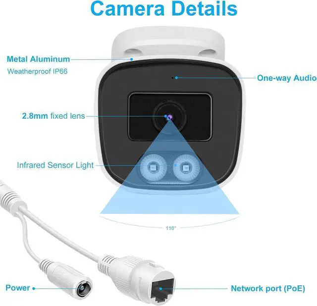 IP66 Waterproof and 2.8MM Wide Angle Lens: Metal housing for outdoor indoor applications. It is designed to withstand extreme temperatures and protected from dust and rain. The 2.8 mm fixed lens on this poe ip camera offers an impressive 108° field of view to cover and protect a wider area.