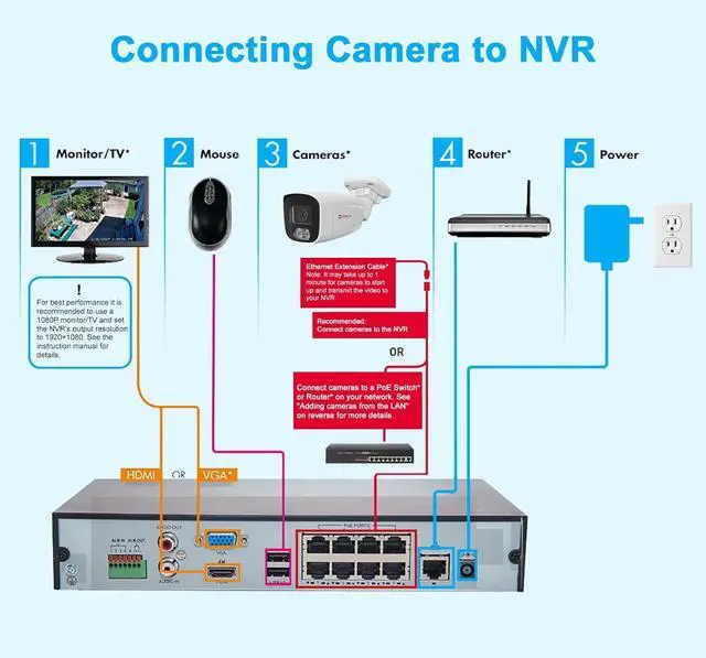 Three Connection Ways to Choose: You can connect the poe camera with an NVR that supports the Onvif protocol. If you don' t have an NVR, you can connect the camera to a DC 48-54V PoE Switch/Injector; If you don' t have an NVR and a PoE switch, you can use a DC12V power adapter for power supply. (power adapter is not included)