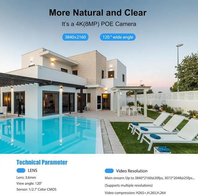 4K Ultra HD Image & 120° Wide AngleWant to watch sharp and crisp videos in real time? Or want to look wider? Try this SV3C 4K (8MP) POE IP Camera! This poe ip camera delivers almost 4 times the clarity of 1080p. With the ability to capture 4K@20fps, 120° wide angle, this poe ip camera can present HD videos for you and allow you to see more.