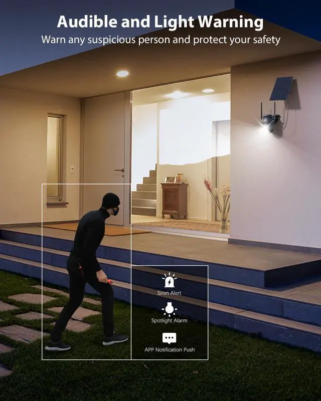 Smart Detection & Instant AlertsThis WiFi Solar Security Camera Outdoor features a built-in PIR sensor with adjustable sensitivity, supports human detection and customizing detection zones to match your property layout, minimizing false alarms from leaves, insects, and other interference while conserving battery life. At night, detected intruders trigger bright floodlights and audible alarms to deter threats. Real-time alerts are instantly pushed to your phone via the Ubox app.