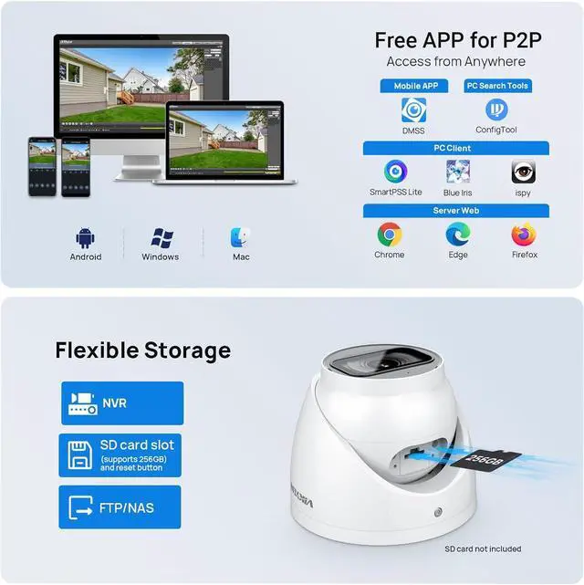 Wide Storages: This ethernet camera uses the H. 265+ encoding standard to record 4 times more video than H. 264. It not only transmits clearer and smoother video, but also saves 83% of disk storage space. Videos also can be saved in the micro SD card (up to 256GB, not included), or FTP server.