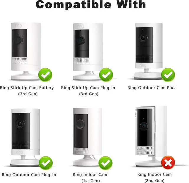 Compatible with Ring Outdoor & Indoor Cam This wall mount bracket is small and exquisite, specially designed for Ring Stick Up Cam Battery/Ring Outdoor Cam Plus/Pro/Plug-In/Elite/Ring Indoor Cam (1st Gen). Also it can be used for other security cameras with 1/4 screw connector like arlo camera, wyze pan cam. Not for Ring Indoor Cam (2nd Gen)