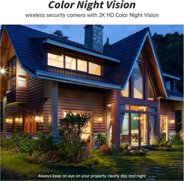 2K Ultra HD Video & Full-Color Night Vision See Every Detail Clearly Experience crystal-clear 2K resolution with enhanced image quality, even when zooming in. Equipped with advanced night vision technology and built-in LED lights, this security camera delivers vivid full-color images even in complete darkness, ensuring 24/7 protection.