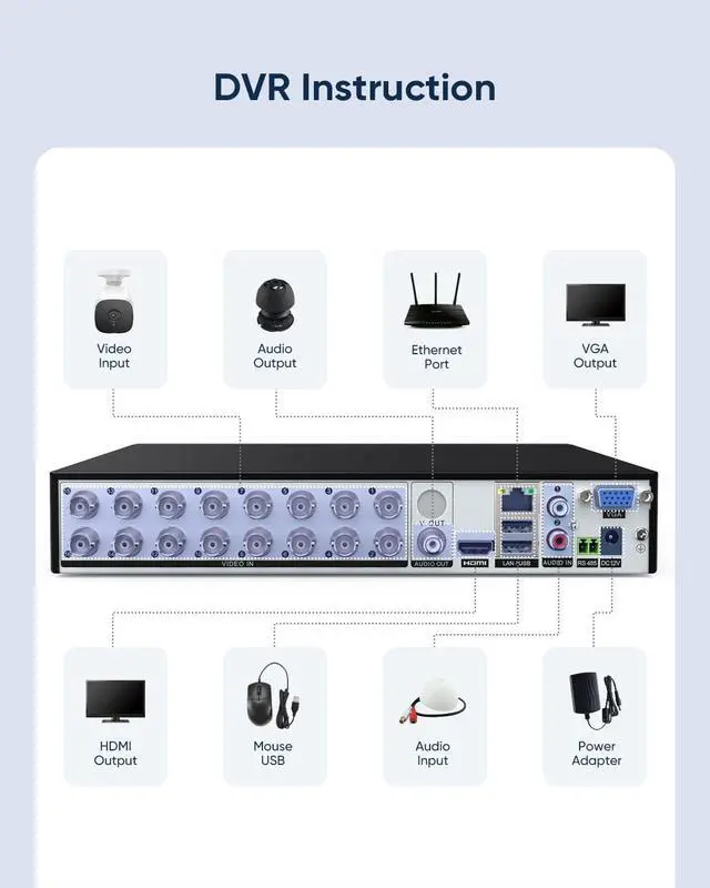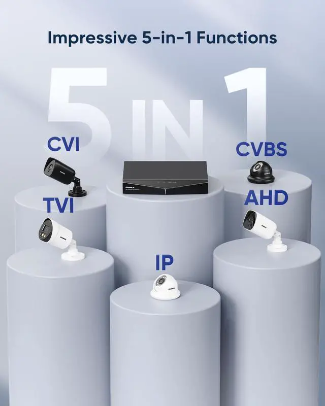 [Powerful 5-in-1 DVR]- The hybrid digital video recorder works with TVI, AHD, CVI, CVBS analog and IP security cameras (up to 1080p Full HD resolution). You may add any type of security camera you want to this DVR for 24/7 recording.