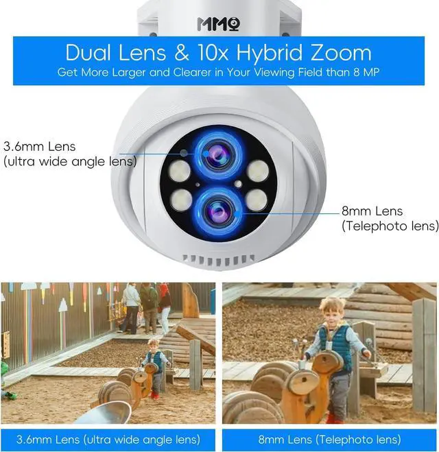 Easy Installation & Multi-User SharingMMQ WIFI camera needs to be plugged into the power supply, plug and play. The outdoor/indoor surveillance cameras are equipped with 10x hybrid zoom dual lenses ( 2.8 mm and 8mm) for high-definition color night vision. PTZ camera supports simultaneous online viewing on multiple devices such as computers and tablets. Multi platform multi user viewing