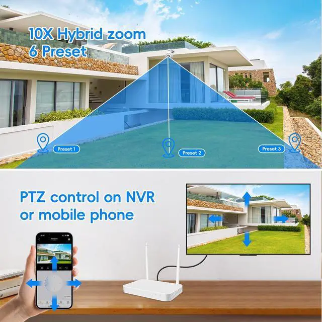 Color NIght Vision & PTZ CameraThe ptz camera outdoor automatically follows objects, you can view 360° wide vision with no blind spot. 4 Infrared LEDs and 4 white lights, this security camera wifi with 10X Hybrid zoom for crystal clear monitoring. - full color up to 20m, black and white up to 30m