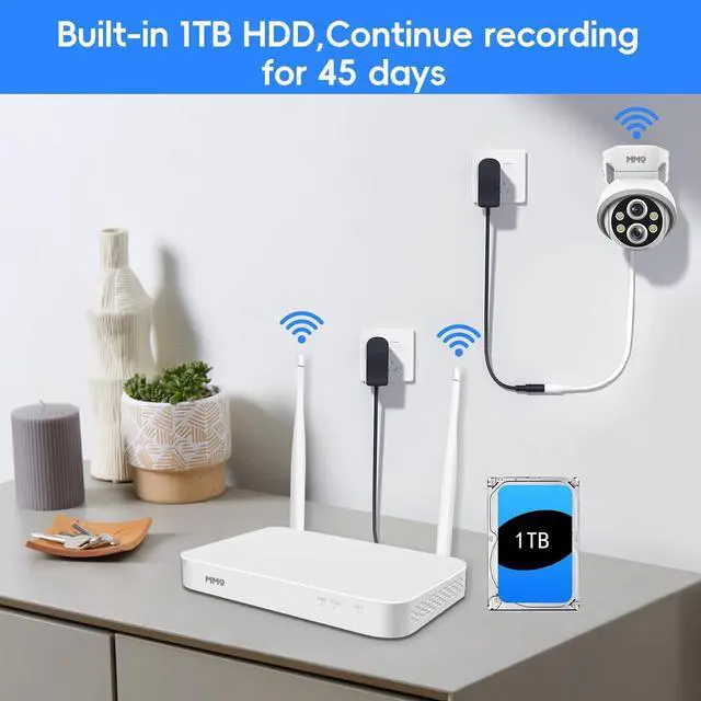 24/7 recording & Auto TrackingThe Dual Lens security camera system is built-in 1TB HDD that supports 24/7 loop recording for 45 days. PTZ Dual Lens camera rotates 355° horizontally and 90° vertically for crystal clear monitoring. Automatically detect and track human movement. Efficiently reduce false alarms and expand surveillan