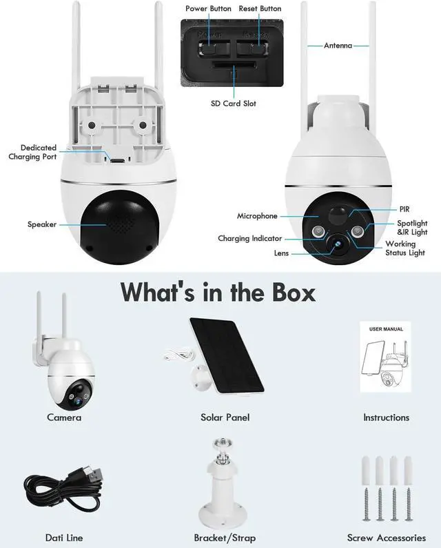 Antenna: Solar Security Camera Wireless Outdoor with a built-in rechargeable battery and solar panel can support 365 days of uninterrupted use, avoiding inconvenient manual charging. The 4dbi antenna gives this outdoor wireless camera a more stable network reception. It only supports 2.4 GHz WiFi for better connectivity/range, but does not support 5 GHz