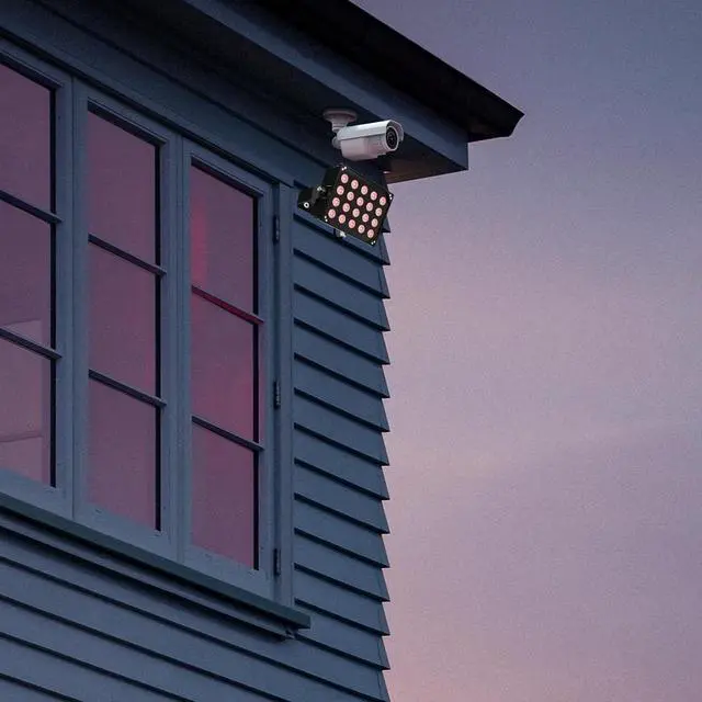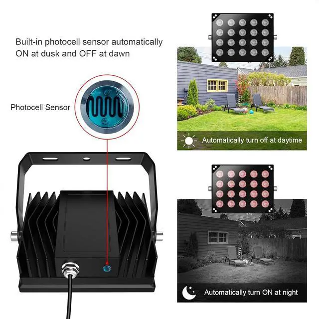 AUTO ON and OFF - Ir floodlight for camera built-in with photocell sensor, the IR illuminators auto switch on at dusk and switch off at dawn, energy saving and secure long lifespan. Wave length 850nm infrared flood light, the beam light is INVISIBLE to naked eyes but give a red glow.
