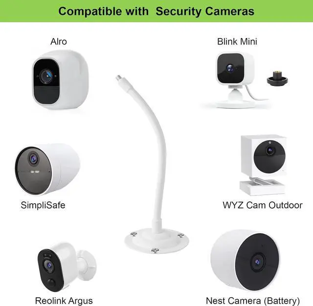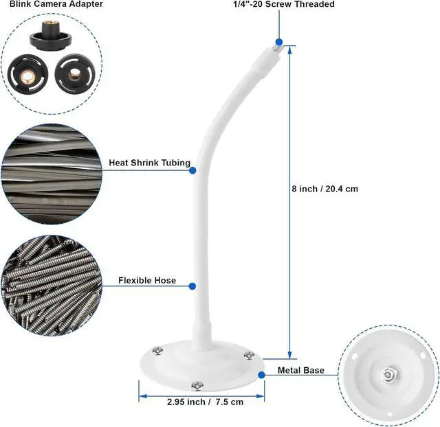 Compatible: Camera stand with standard 1/4 thread screw compatible with Arlo Pro/Pro 2/Pro 3/Pro 4/Ultra/Ultra 2/ Arlo Essential/Arlo Pro 5S 2K/Go 2 Cameras, All-New Blink Outdoor 4 (4th Gen), Blink Outdoor (3rd Gen) XT3Blink Outdoor/ XT/XT2, Blink Mini, WYZE Cam Pan V3 /WYZE Battery Cam Pro/WYZE Cam V3, SimpliSafe Outdoor Camera, Nest Outdoor Camera (Battery). with 1/4" -20 threaded screw.